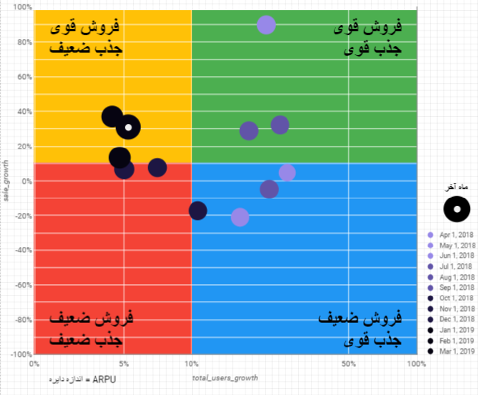 - ناحیه فروش قوی/جذب قوی: در این حالت هم فروش و هم کاربر رشد قابل توجهی نسبت به ماه قبل داشته است. تراکم نقاط در این ناحیه به معنای عملکرد بسیار قوی در دو حوزه مالی و کاربر است.