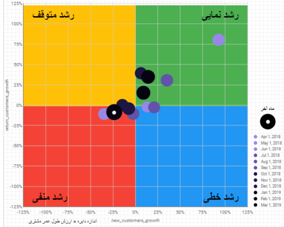 به طور کلی، مشتری کاربری است که اقدام نهایی سرویس را انجام داده است. اقدامی که به طور مستقیم برای کسبوکار ارزش (معمولا درآمد) خلق میکند. در این مدل میخواهیم بدانیم عملکرد سرویس در خلق و نگهداری مشتری با کیفیت (سودآور) چگونه است. محور افقی نشاندهنده رشد ماهبهماه مشتری جدید است و نمودار عمودی رشد ماهبهماه مشتری بازگشتی. اندازه هر دایره، ارزش طول عمر مشتری (CLTV) را در آن ماه نشان میدهد.