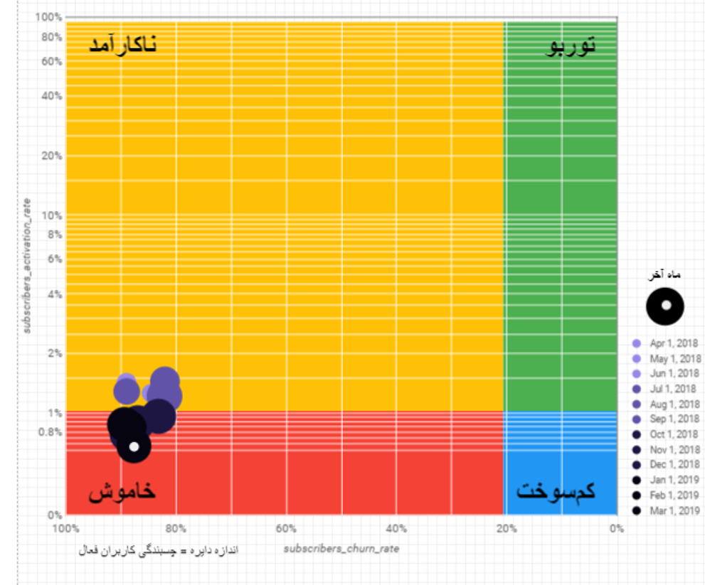 در این تحلیل با استفاده از سه عنصر اصلی کارایی (نرخ ریزش، نرخ تبدیل و چسبندگی) میتوان روند کارایی سرویس را ماه به ماه ارزیابی و با هم مقایسه کرد.