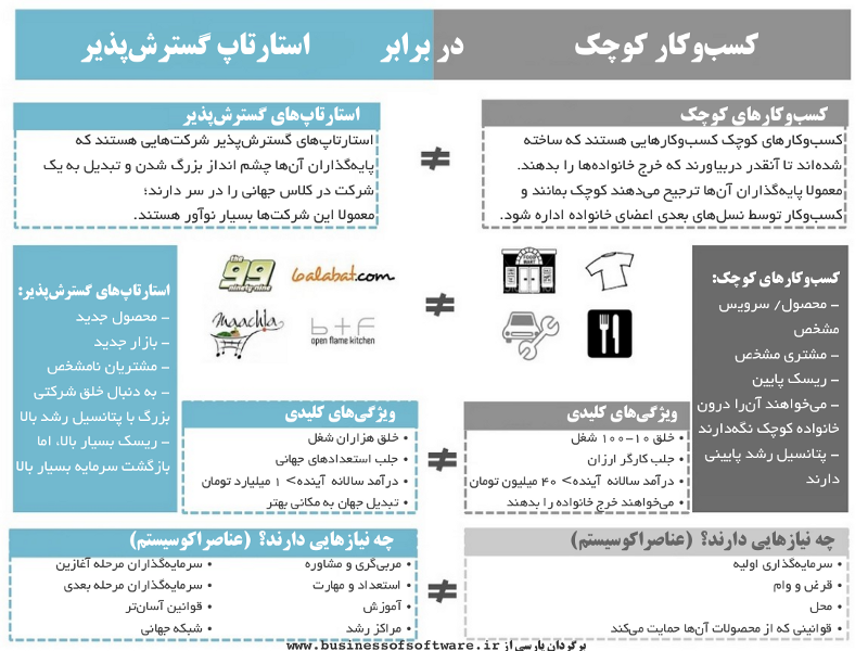 این صحبت به این معنی نیست که کسب و کارهای کوچک را کنار بگذاریم، ولی باید تفاوت بین آنها را دریابیم. با وجود اینکه استارتاپ گسترش پذیر بازارشان را به آشوب میکشند، بسیاری شغل ایجاد میکنند، نیروهای با استعداد را جذب میکنند و ارزش و پول بسیاری را خلق میکنند، کسبوکارهای کوچک فقط تلاش میکنند که تقاضای در حال رشد در یک بازار تثبیت شده را پاسخ دهند و همانقدر پول بسازند که خرج خانوادهشان را بدهد.